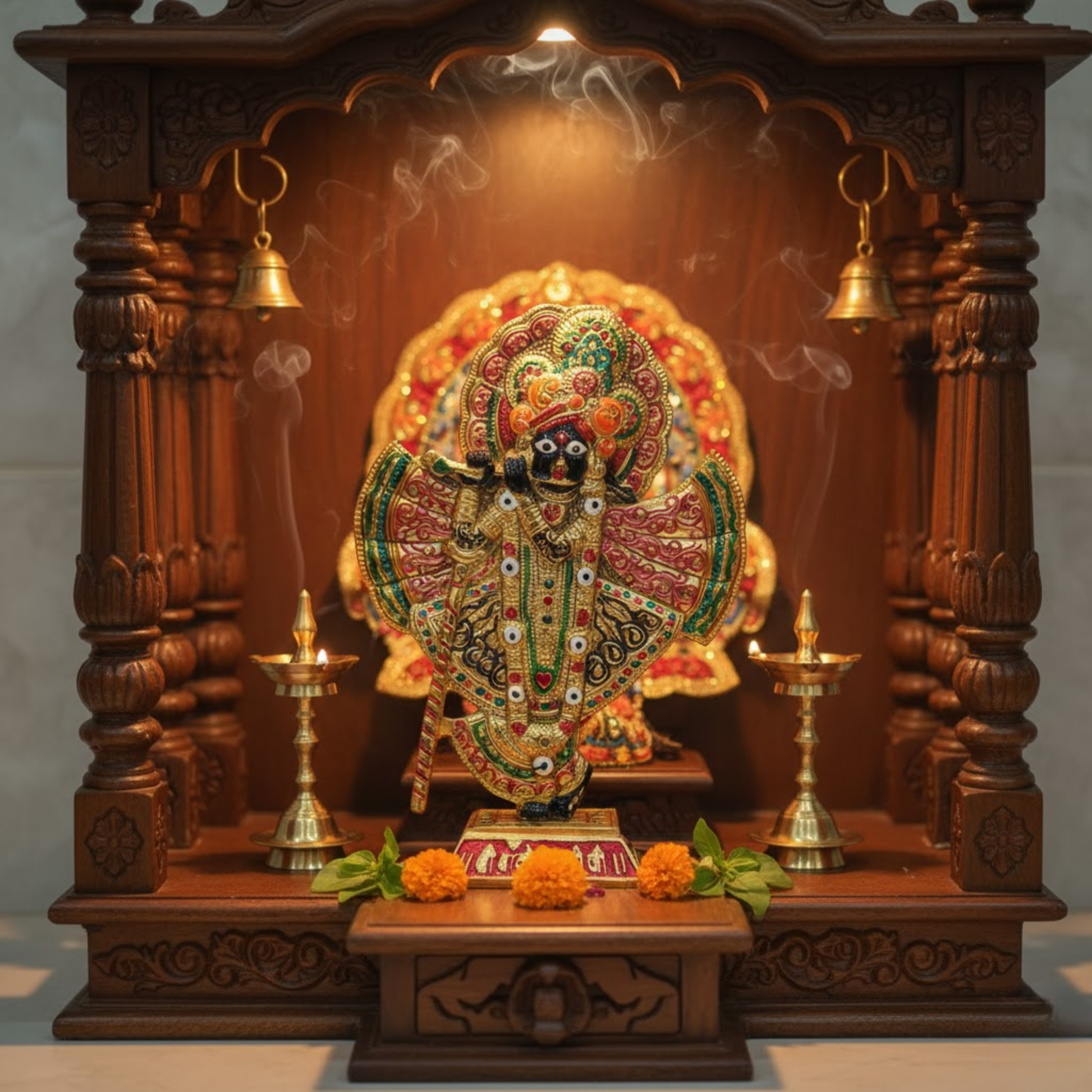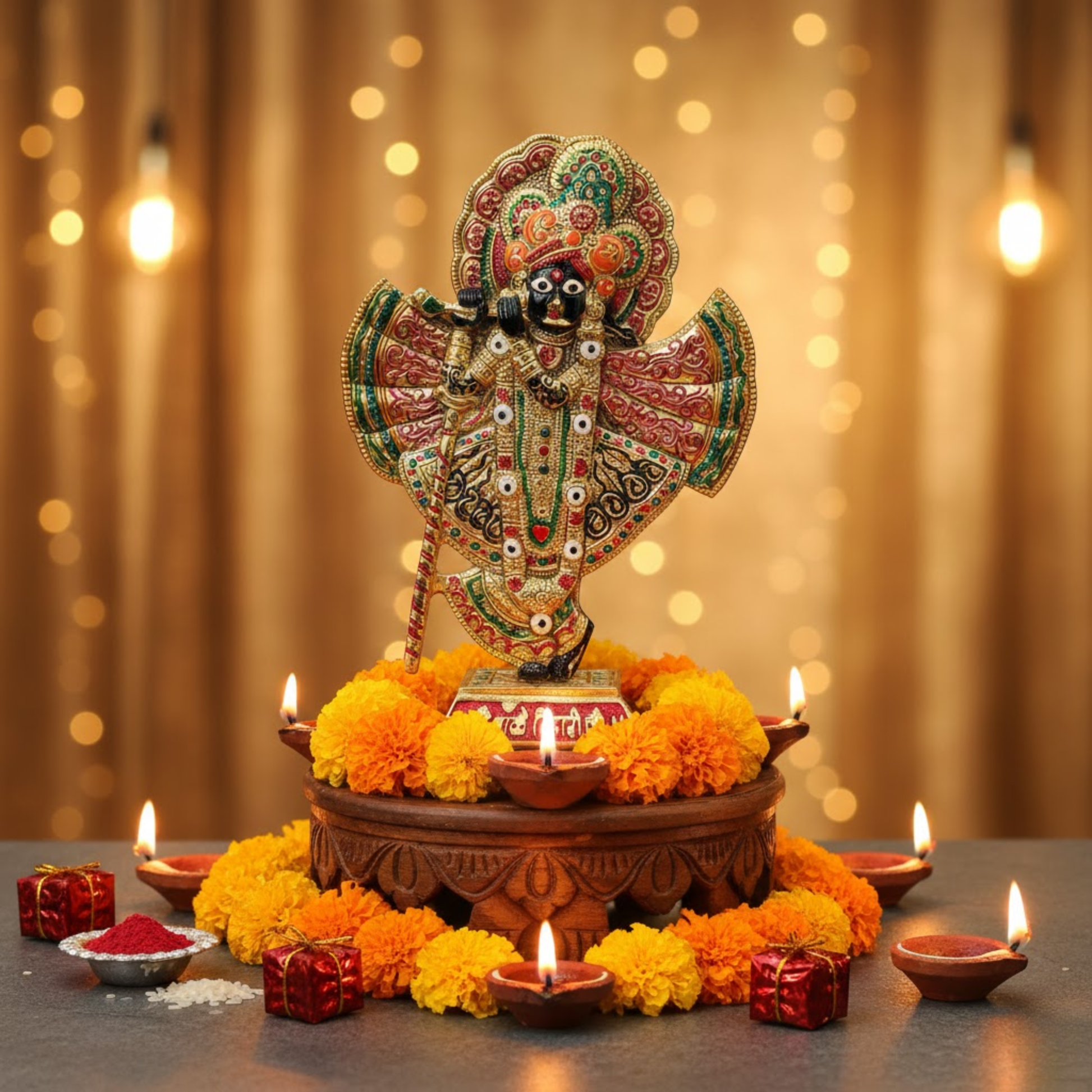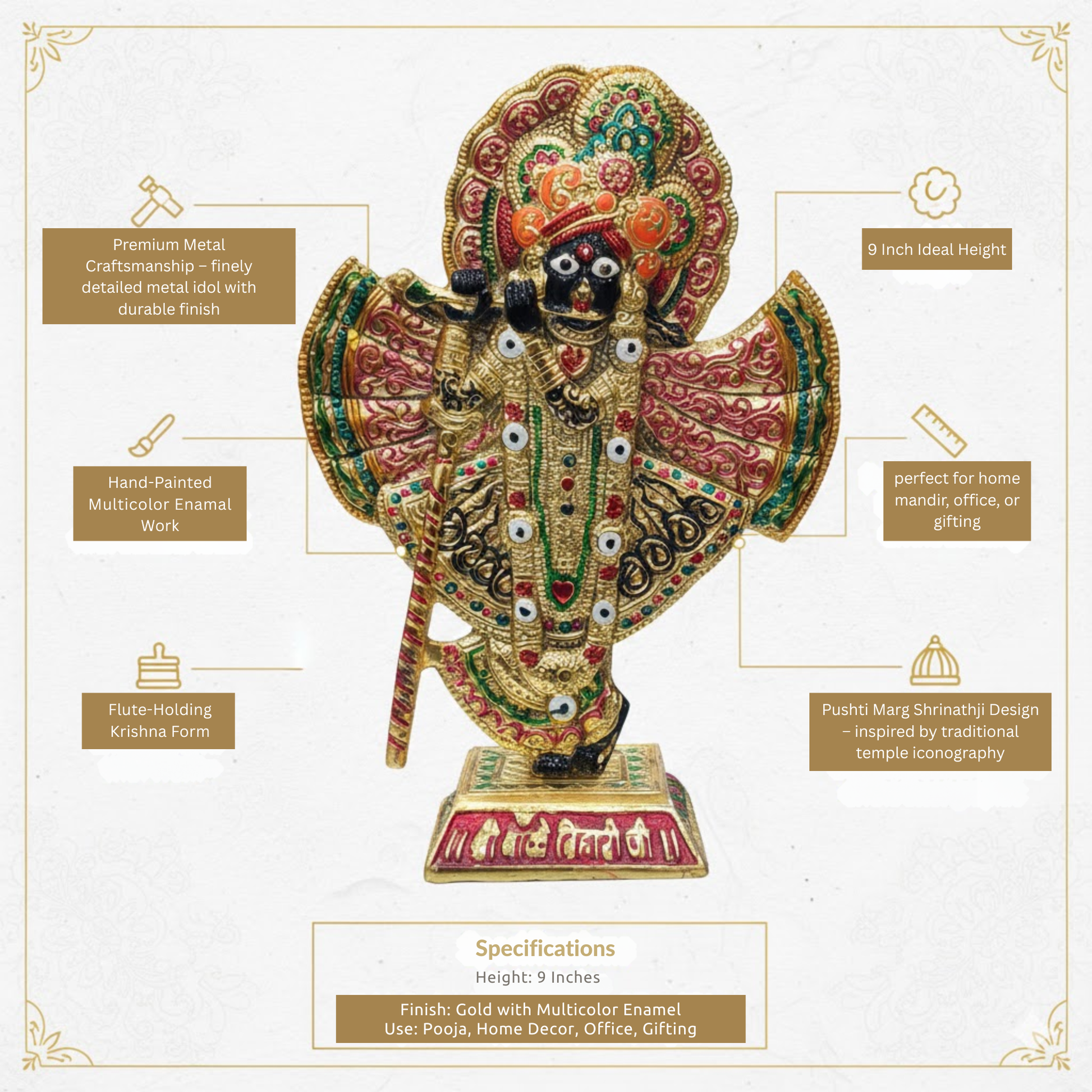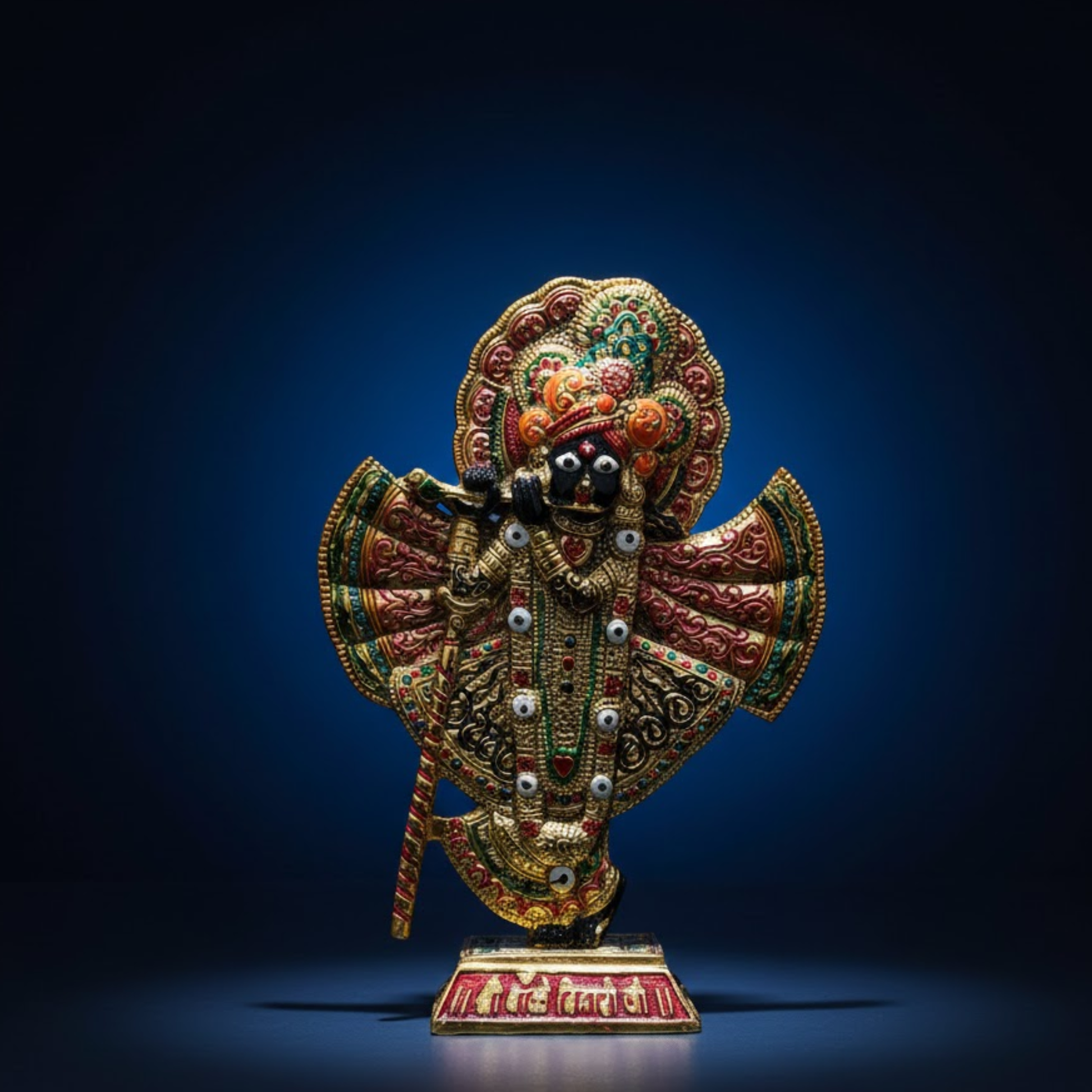 This idol represents Shrinathji, a revered form of Lord Krishna worshipped in the Pushti Marg tradition, and is also associated with Banke Bihari Krishna, symbolizing divine love, joy, and compassion. Lord Krishna is depicted holding a flute, a timeless symbol of harmony and devotion, while his graceful posture and serene expression radiate positivity and spiritual calm.